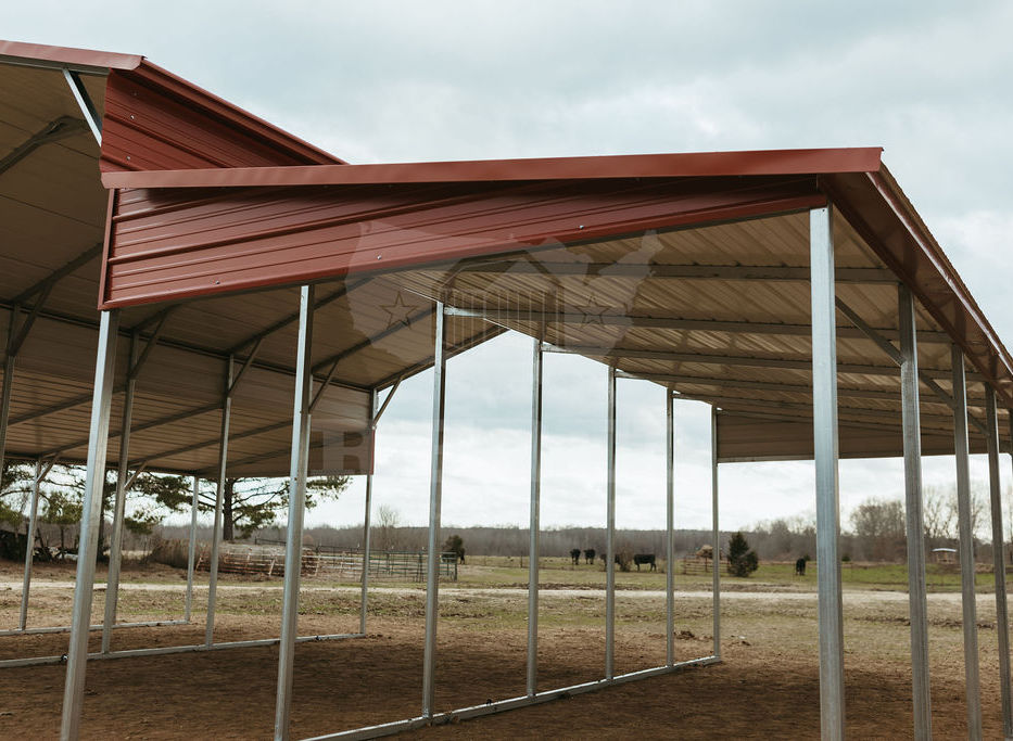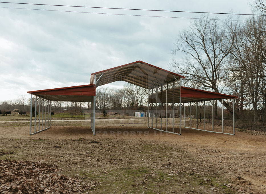 This is a 42x30x12x8 Open Style Horse Barn! It has a boxed eave style roof with an 18x30x12 Center section with 2-12x30x8 Lean To's! The colors that you see are barn red for the roof, trim, and gables.