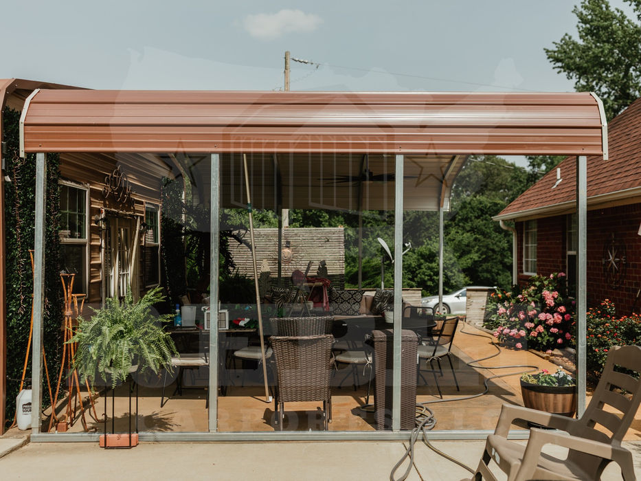 This is a Regular style 24x15x8 Carport on concrete, with the roof being brown and the trim being stone!